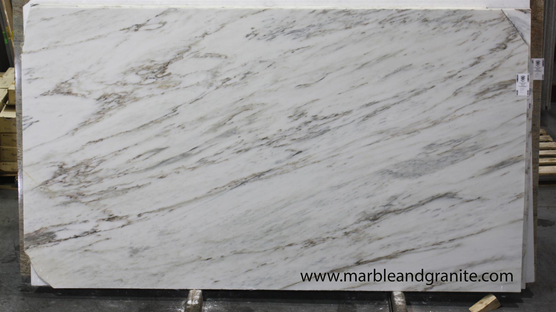 Most of the material on the side of the quarry is Eureka Danby. It’s darker gold with medium to heavy gray veins, and it’s often compared to Calacatta Gold. When the material has less gold veining, it’s classified as Imperial.