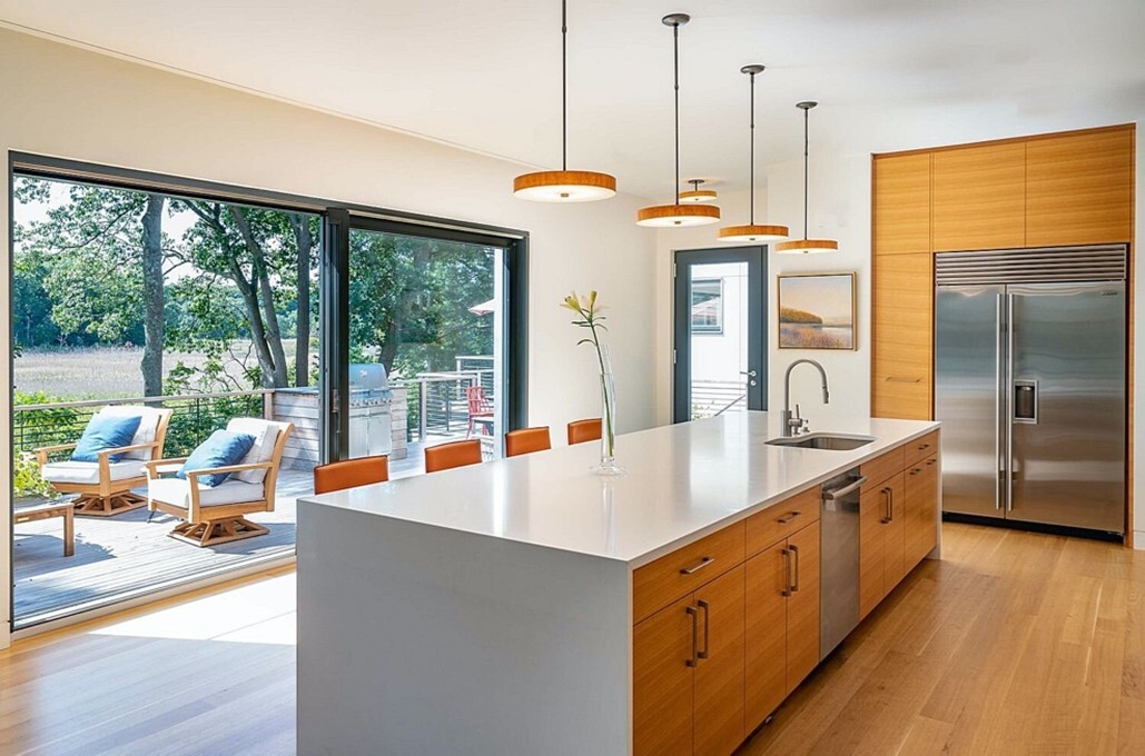 This “net-zero” home in Hingham, Ma. features Vega White countertops from Santa Margherita Quartz. Photo courtesy of Eric Roth.