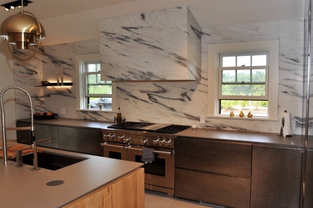 Designed by Jill Vieth of White Hart Design on Nantucket, this kitchen recently won the Builders and Remodelers Association of Greater Boston’s Gold PRISM Award, which recognizes the finest projects and outstanding achievements in the home building industry. The kitchen beautifully blends manmade materials with those made by Mother Nature. Here, Vieth mixed Neolith surfacing with gorgeous natural stone—both supplied by Marble & Granite, Inc. Neolith in Concrete serves as countertops while a full-height backsplash of Royal Danby Marble covers perimeter walls. The result is an eye-catching space that’s clean and modern as well as warm and welcoming.